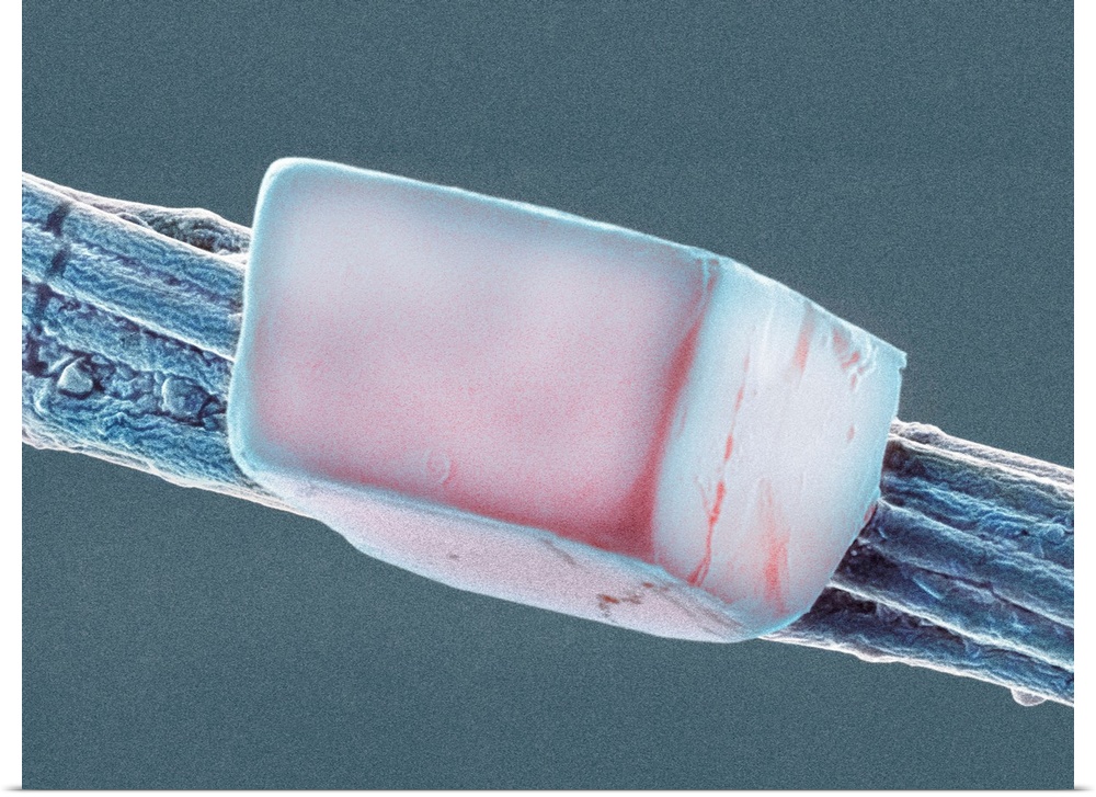 <p>Coloured scanning electron micrograph (SEM) of a salt crystal on spider silk. The cobweb was located along the North Shore of Oahu, Hawaii. Saltwater spray from ocean condensed on spider web silk and crystallized on the silk fibres. Magnification: x1,400 when shortest axis printed at 25 millimetres.</p>