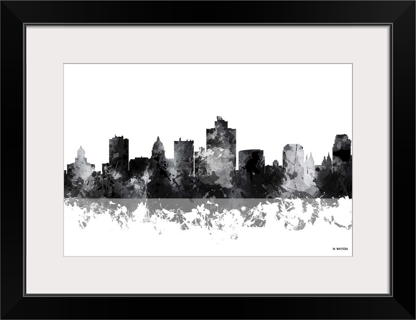 <p>Contemporary black and white watercolor skyline casting a mirror-like reflection below.</p>