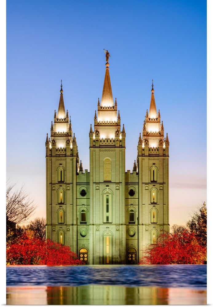Salt Lake Temple, Red Bushes at Night, Salt Lake City, Utah