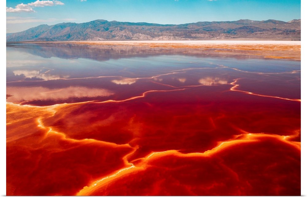 <p>Salt loving halobacteria turns a shallow salt lake bed red, Lone Pine, California, United States of America</p>
