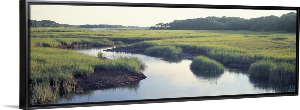 <p>Long horizontal photo on canvas of a river running through a marshy landscape.</p>