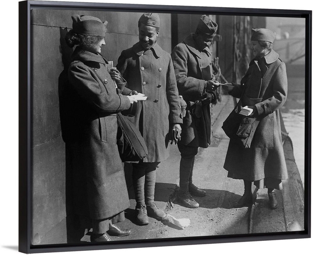 <p>Salvation Army lassies giving sweets to African American soldiers, 1919.</p>