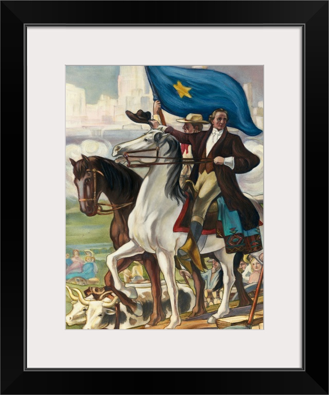<p>General Sam Houston, President of the Republic of Texas is seen entering the newly founded city of Houston in August 1837. (The first capitol of Texas and vision of the present city is in the background. Mural in New Southern Pacific Passenger station, Houston, Texas.)</p>
