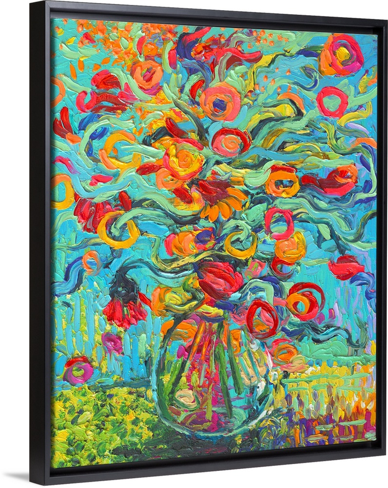<p>Brightly colored contemporary artwork of a fingerpainting of red and orange flowers in a vase.</p>