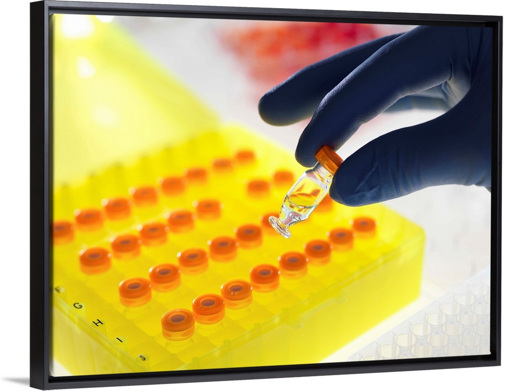 <p>MODEL RELEASED. Sample preparation. Scientist holding a vial containing a liquid sample.</p>