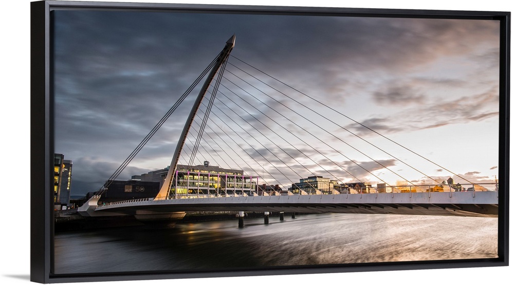 <p>Panoramic photograph of the Samuel Beckett Bridge, a cable-stayed bridge in Dublin, Ireland going across the River Liffey, at sunset.</p>