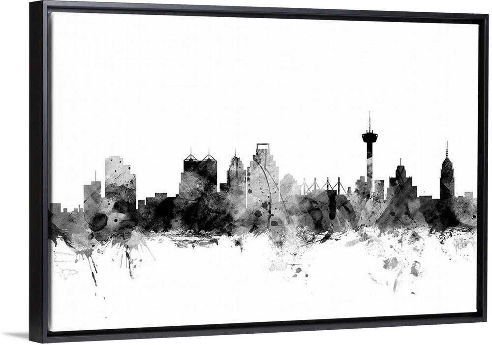 <p>Contemporary artwork of the San Antonio city skyline in black watercolor paint splashes.</p>