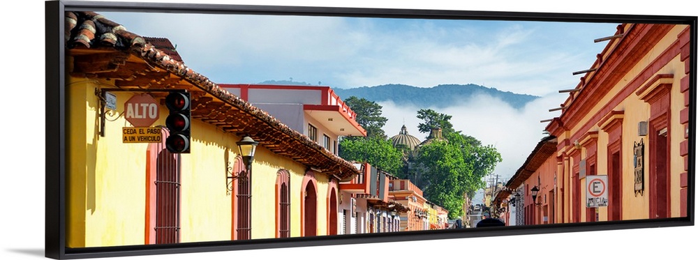 <p>Panoramic photograph of a streetscape at San Cristobal de Las Casas in Chiapas, Mexico, with heavy fog in the background. From the Viva Mexico Panoramic Collection.</p>