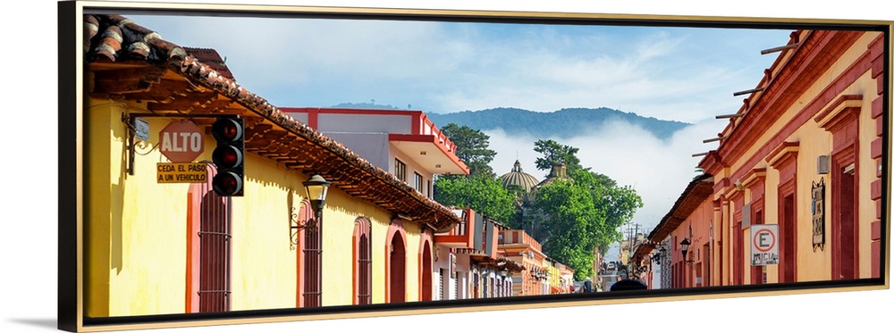 <p>Panoramic photograph of a streetscape at San Cristobal de Las Casas in Chiapas, Mexico, with heavy fog in the background. From the Viva Mexico Panoramic Collection.</p>