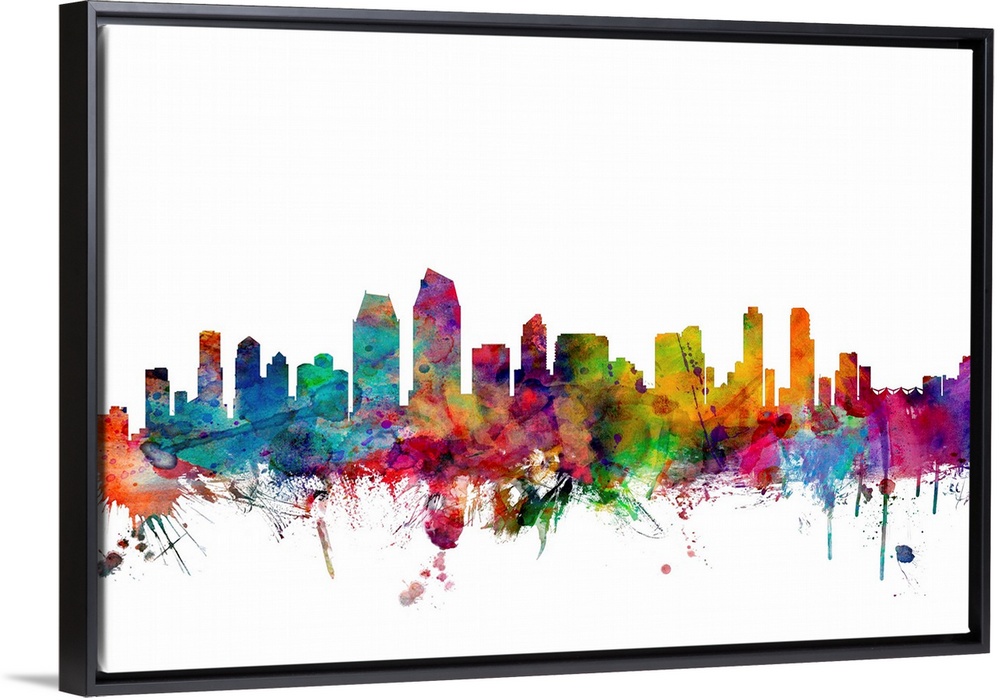<p>Watercolor artwork of the San Diego skyline against a white background.</p>