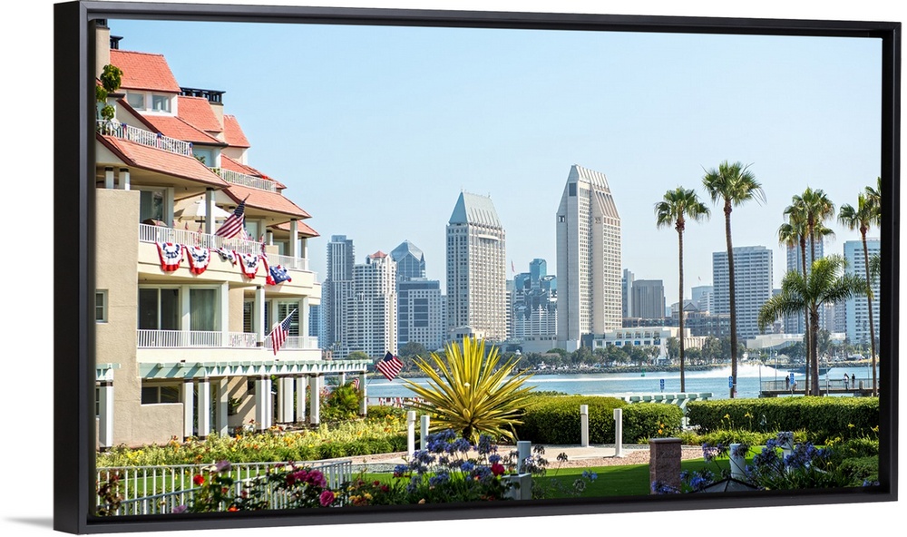<p>Photograph of part of the San Diego, California skyline with flowers, palm trees, and American flags in the foreground.</p>