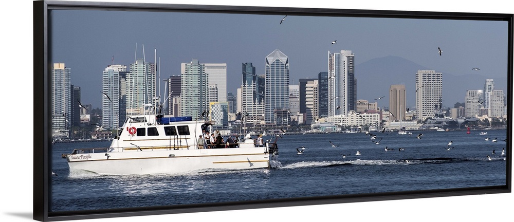 <p>Panoramic photograph of a charter fishing boat on the Pacific Ocean with seagulls flying around it and the San Diego skyline in the background.</p>