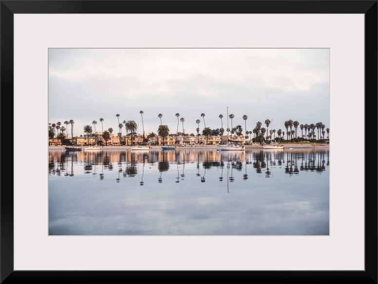 <p>Photograph of beach houses, palm trees, and boats on the San Diego coast reflecting into the water.</p>