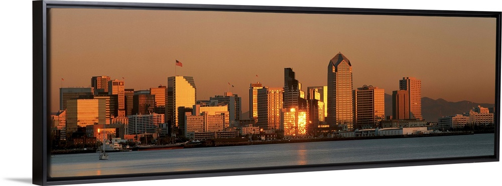 <p>This is the San Diego skyline with the bay in front at sunset. The reflected light on the buildings is golden.</p>