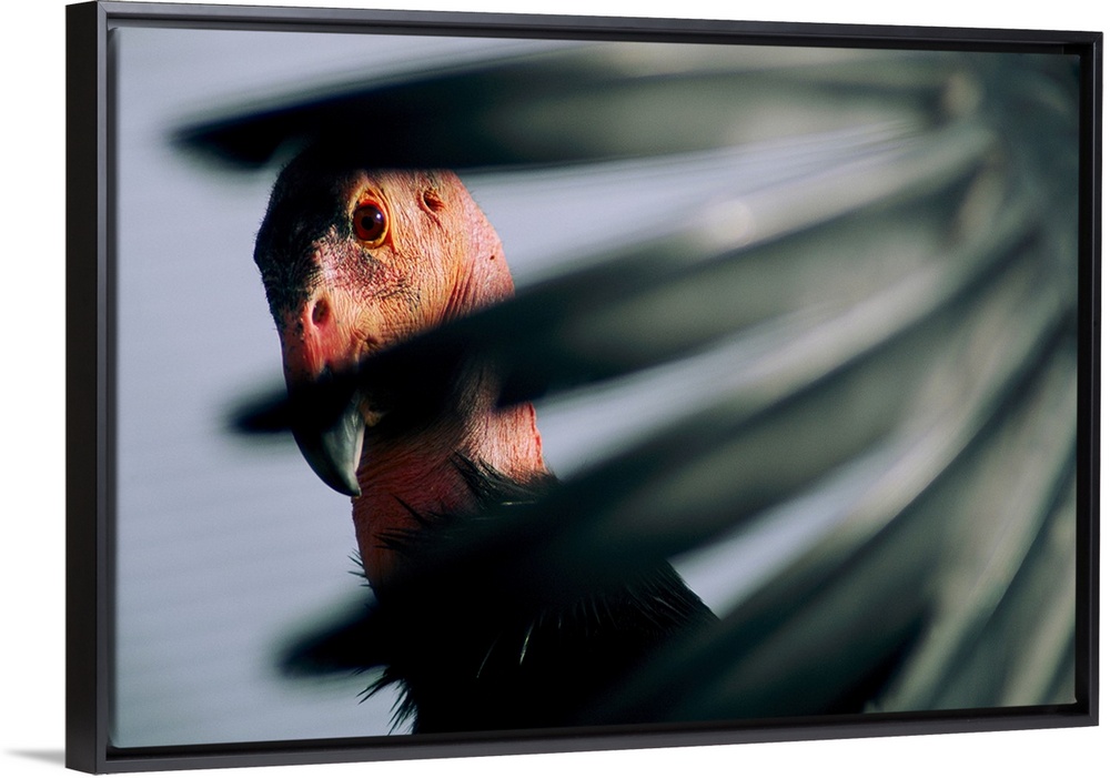 <p>A view of a California condor through its own primary feathers. This park is where the California condor was brought back from the brink of extinction. The po pulation, down to about 21 in 1982, is now up to about 100 in captivity and 17 in the wild.</p>