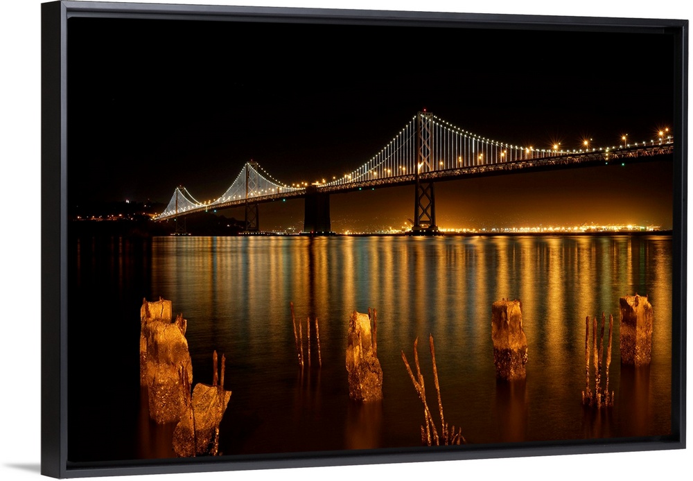 <p>The Bay Bridge in San Francisco lit up at night, as seen from the shore.</p>