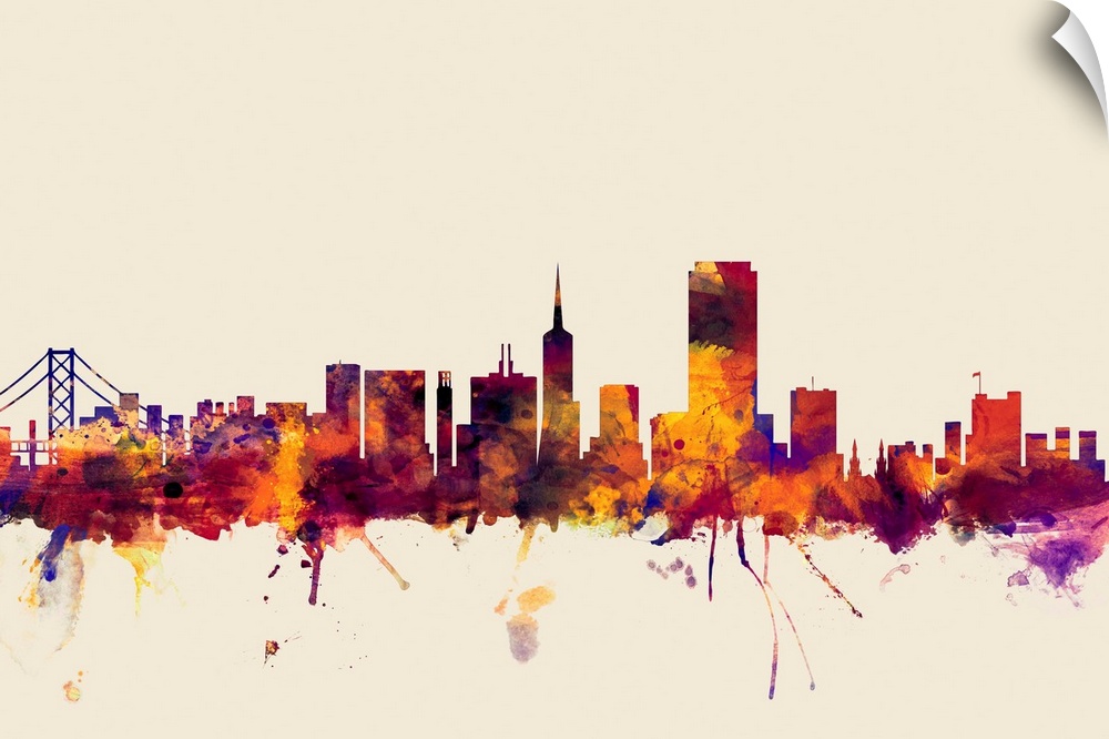 <p>Watercolor artwork of the San Francisco skyline against a beige background.</p>