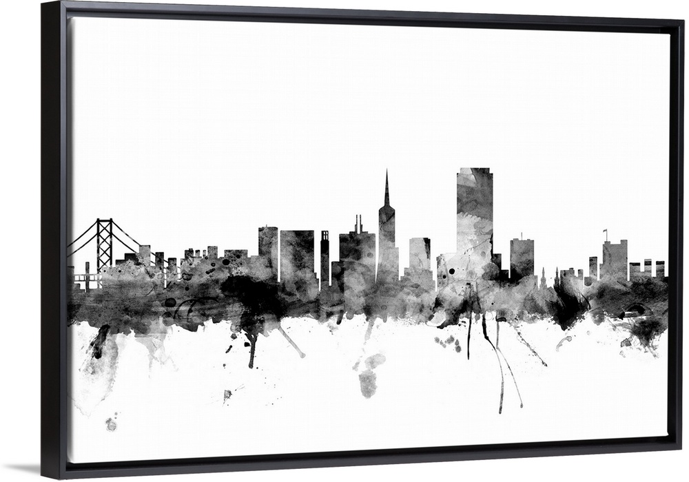 <p>Contemporary artwork of the San Francisco city skyline in black watercolor paint splashes.</p>