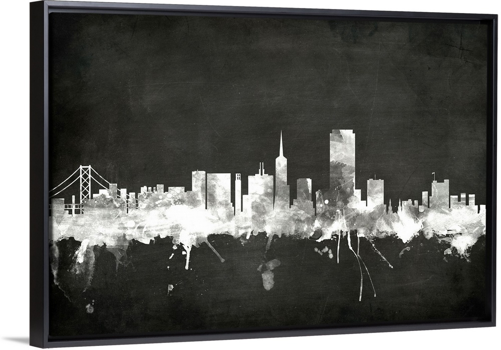 <p>Smokey dark watercolor silhouette of the San Francisco city skyline against chalkboard background.</p>