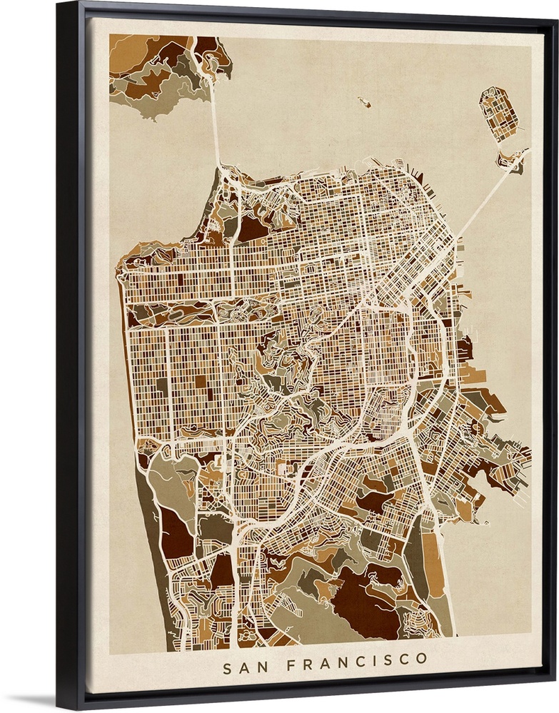 <p>Contemporary artwork of a map of the city streets of San Francisco in dark brown tones.</p>