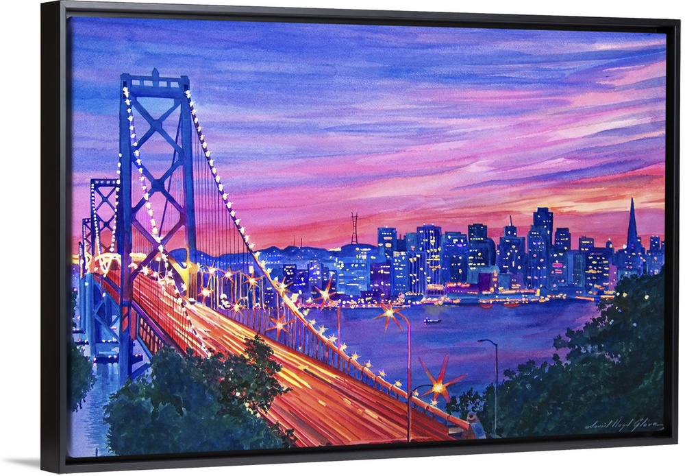 <p>Painting of the San Francisco Bay Bridge at dusk with the city lights in the distance.</p>
