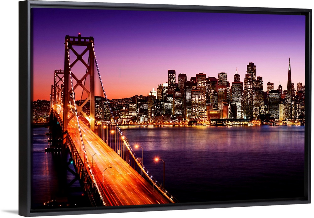 <p>San Francisco skyline and Bay Bridge at sunset, California.</p>