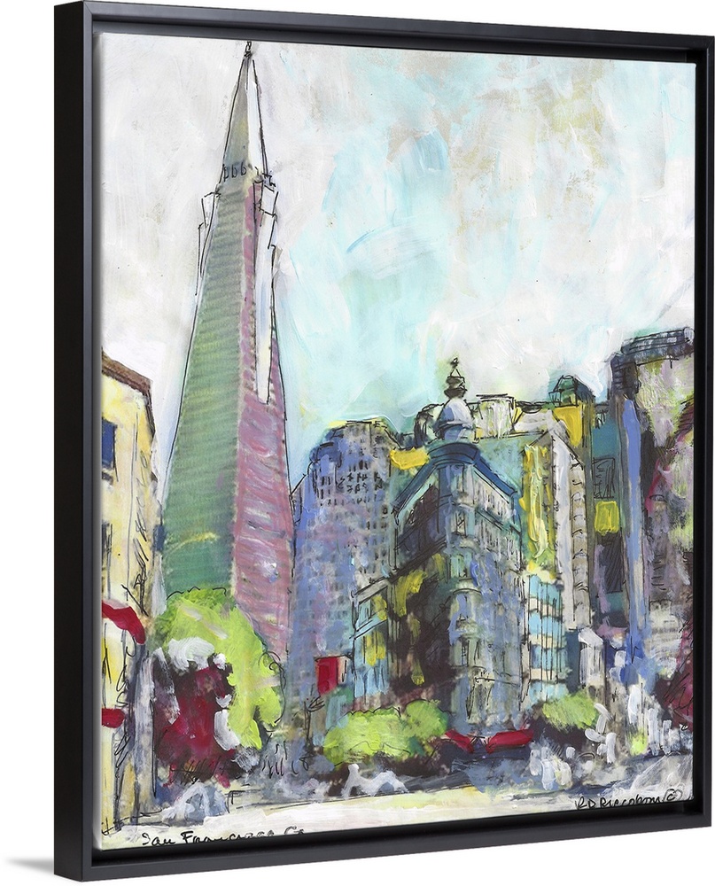 <p>San Francisco Streets by artist RD Riccoboni. The contemporary scene shows this California City skyline with the Trans America Tower building piercing the foggy sky with older historic Victorian architecture in the foreground.</p>