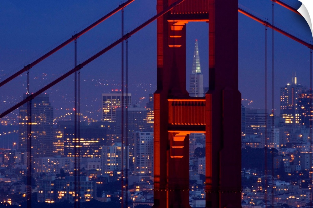 <p>A dusk view of San Francisco with the Transamerica building through the Golden Gate Bridge.</p>