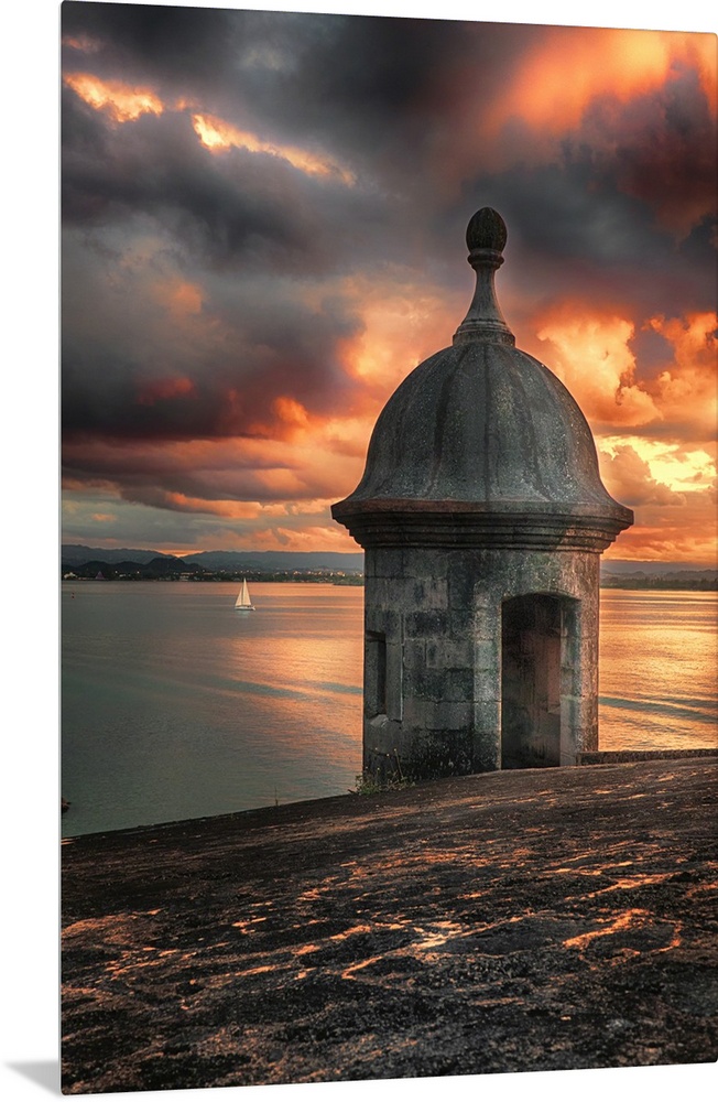 <p>Sentry Post on the City Wall Overlooking a Bay at Sunset, Old San Juan, Puerto Rico.</p>