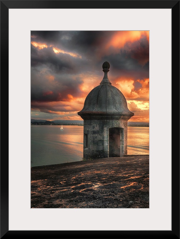 <p>Sentry Post on the City Wall Overlooking a Bay at Sunset, Old San Juan, Puerto Rico.</p>