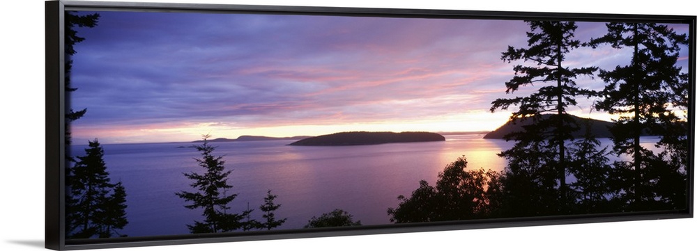 <p>The sunsets below on the ocean in this landscape photograph of small isles off the coast of Washington State in this panoramic wall hanging.</p>
