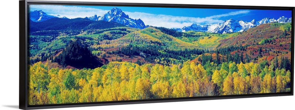<p>Panoramic photograph showcases forests filled with vibrantly colored trees spread out over rolling hills in a section of Colorado. Located in the distance is a range of snow covered mountains as they span the horizon.</p>