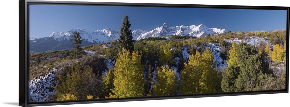 <p>San Juan Mountains and Aspen trees in fallcolor at sunrise, Dallas Divide, Ouray, Rocky Mountains, Colorado, USA, September 2006</p>