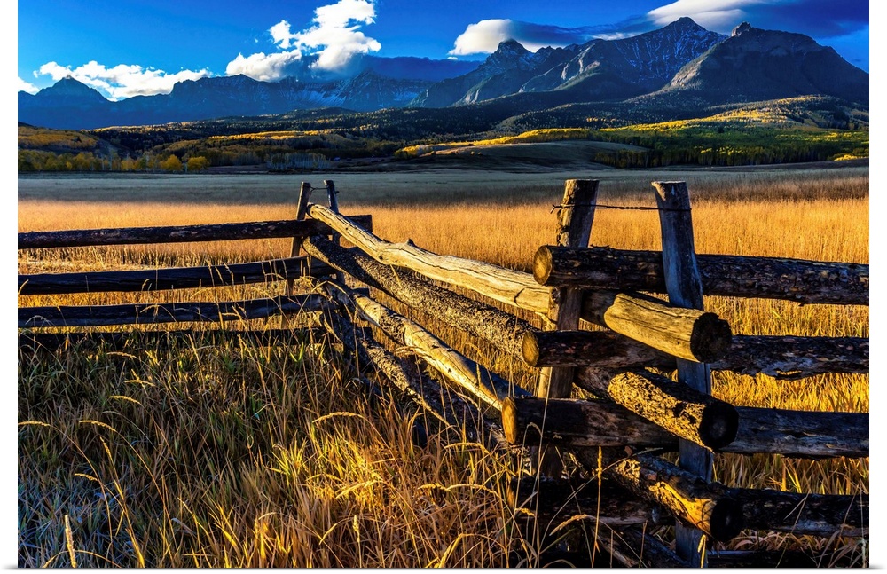 <p>San Juan Mountains In Autumn, Near Ridgway Colorado - Off Hastings Mesa, Dirt Road To Telluride, County Road 58p, "Last Dollar Road" With Rail Fence.</p>