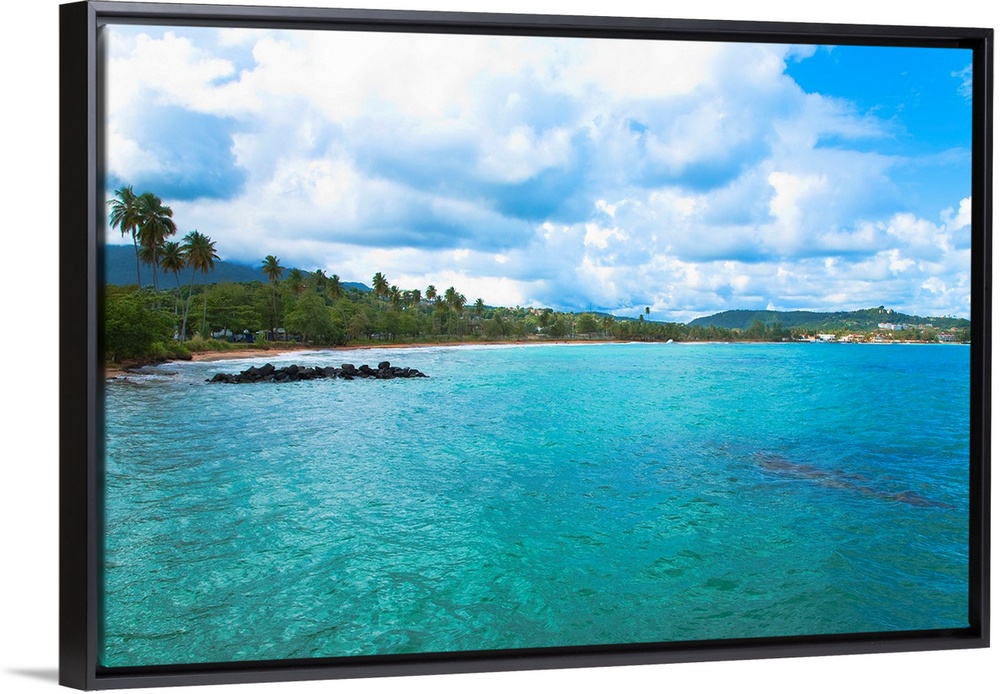 <p>San Juan, Puerto Rico - Calm water is seen in the bay of a tropic island. Trees and beach can be seen in the background. Horizontal shot.</p>
