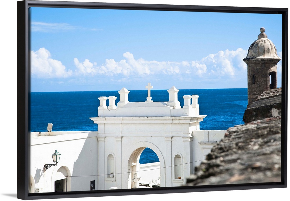 <p>San Juan, Puerto Rico - A white building holds the entrance to a cemetery while above is an ancient fort defensive watchtower. Horizontal shot.</p>