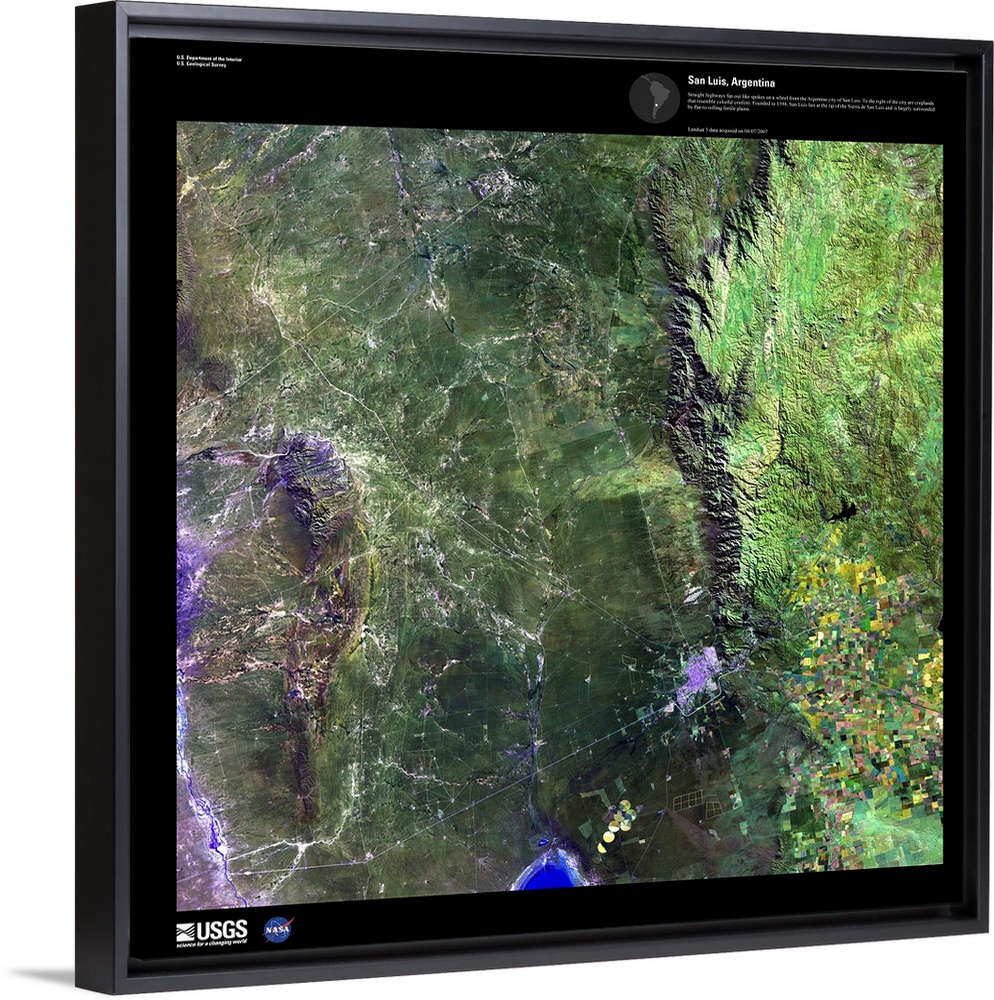 <p>Straight highways fan out like spokes on a wheel from the Argentine city of San Luis. To the right of the city are croplands that resemble colorful confetti. Founded in 1594, San Luis lies at the tip of the Sierra de San Luis and is largely surrounded by flat-to-rolling fertile plains. April 7, 2007.</p>