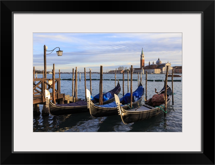 <p>Gondolas, San Marco waterfront at sunset in winter, view to San Giorgio Maggiore, Venice, Veneto, Italy</p>