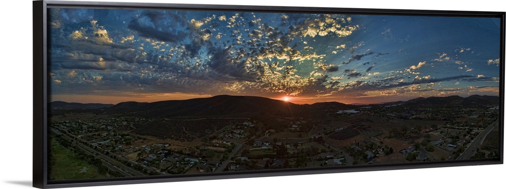 <p>Sunset in San Marcos. This is a colorful aerial panoramic at sunset in this North county San Diego, Southern Caliornia town.</p>