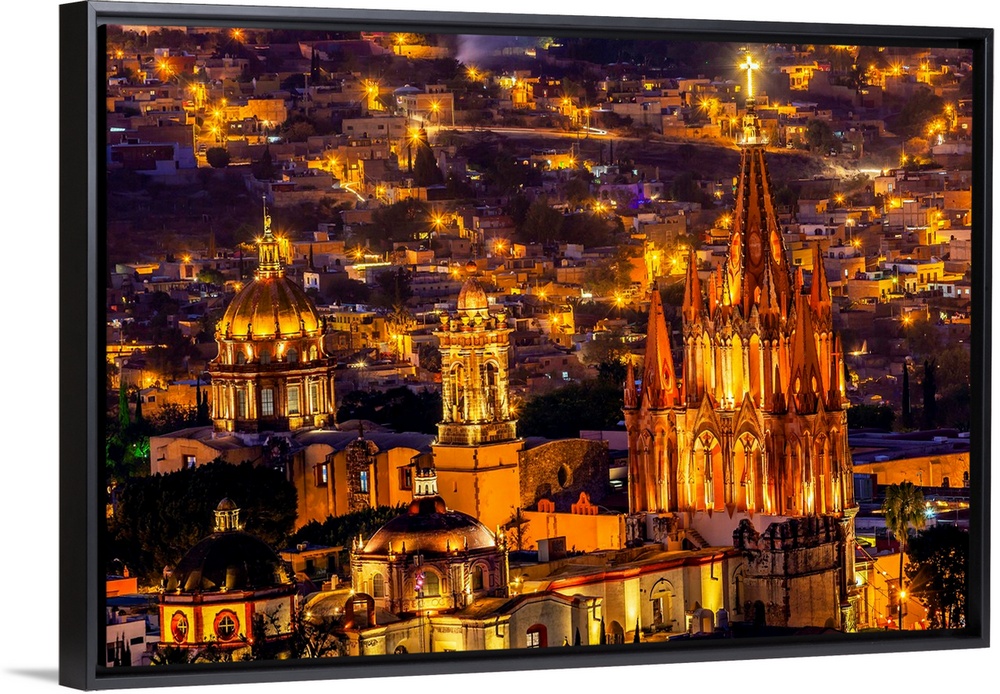 <p>San Miguel de Allende, Mexico, Miramar Overlook Night Parroquia Archangel Church Close Up, Churches Houses.</p>
