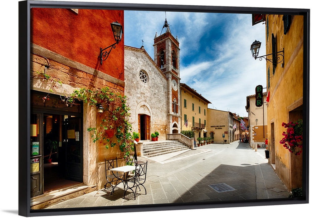 <p>Street with a Catholic Church, San Quirico, Tuscany, Italy.</p>