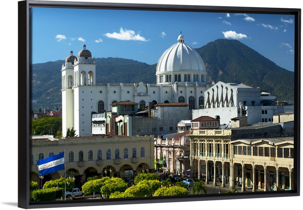 <p>San Salvador, El Salvador, Plaza Libertad, Metropolitan Cathedral Of The Holy Savior, San Salvador Volcano Consisting Of El Boqueron Volcano Crater And The Iconic Picacho Peak</p>