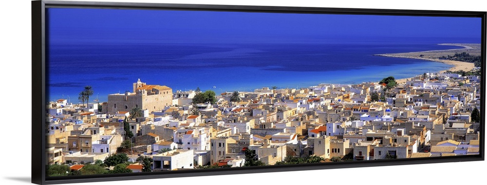 <p>This is a landscape photograph of a coastal village and the sea beyond it in this panoramic wall art.</p>