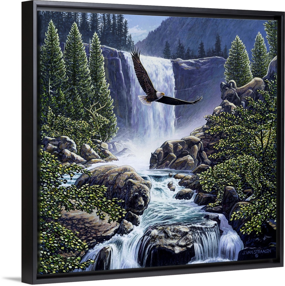 <p>Eagle flying over a river with a waterfall behind him.</p>