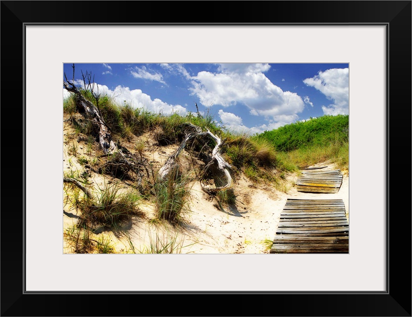<p>Wooden walkway through a sandy beach with dune grass.</p>