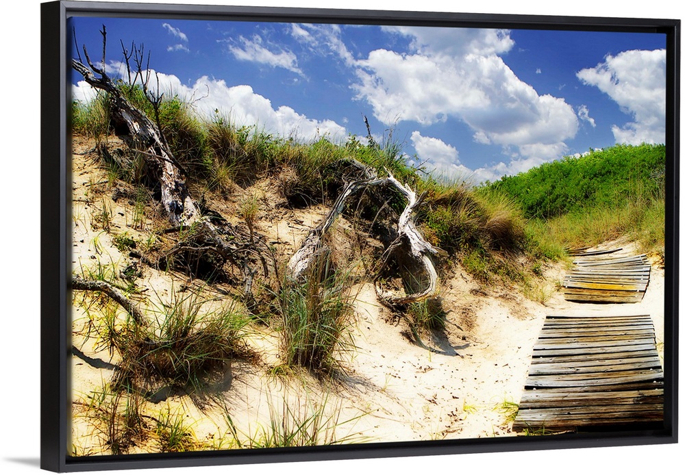 <p>Wooden walkway through a sandy beach with dune grass.</p>