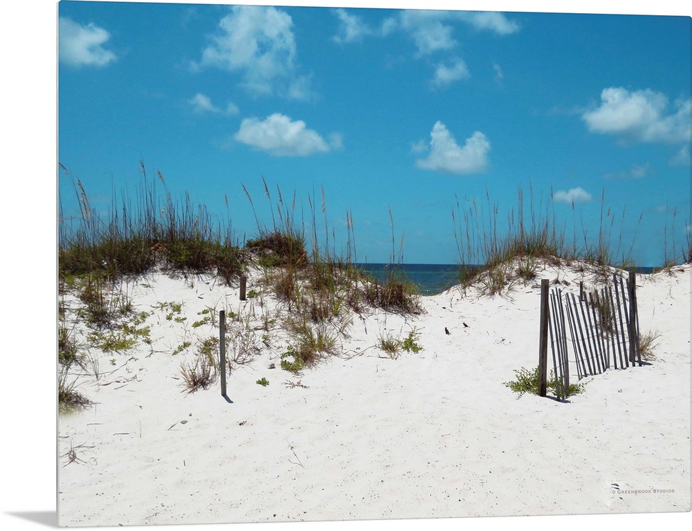 <p>Landscape photograph of sand dunes with the ocean in the background and blue skies.</p>
