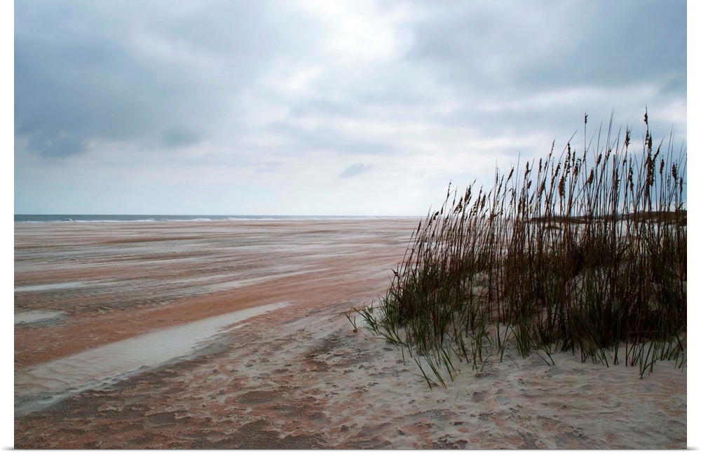 <p>Photograph of an idyllic sandy beach with soft puffy clouds in the sky.</p>
