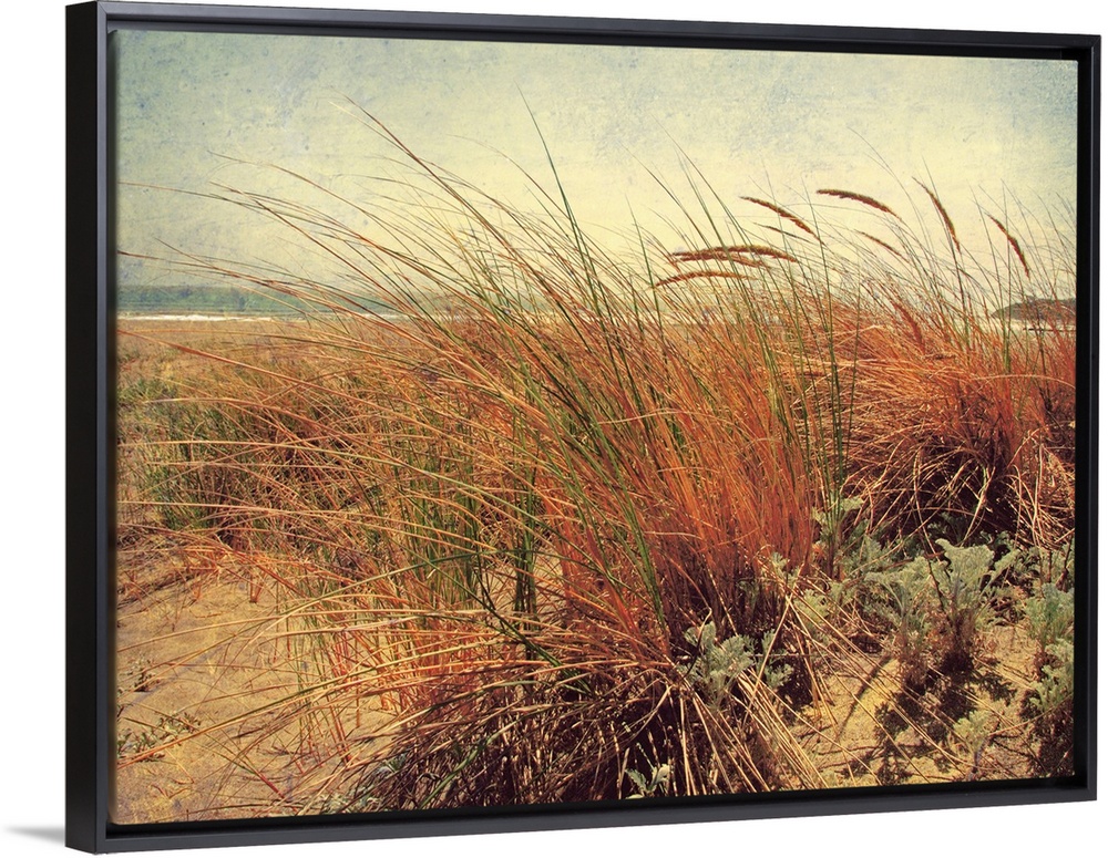 <p>Large photograph showcases the high grass of a sandy beach gently blowing in the wind, while the ocean in the background calmly makes its way to shore. Artist overlays subtle brush strokes to help add depth.</p>