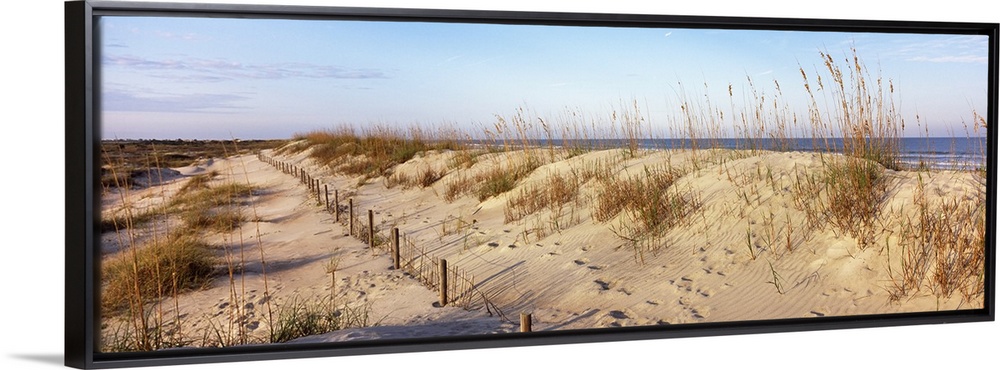 <p>Large horizontal photograph of grassy sand dunes on a beach at the Anastasia State Recreation Area, beneath a light blue sky in St. Augustine, Florida.</p>